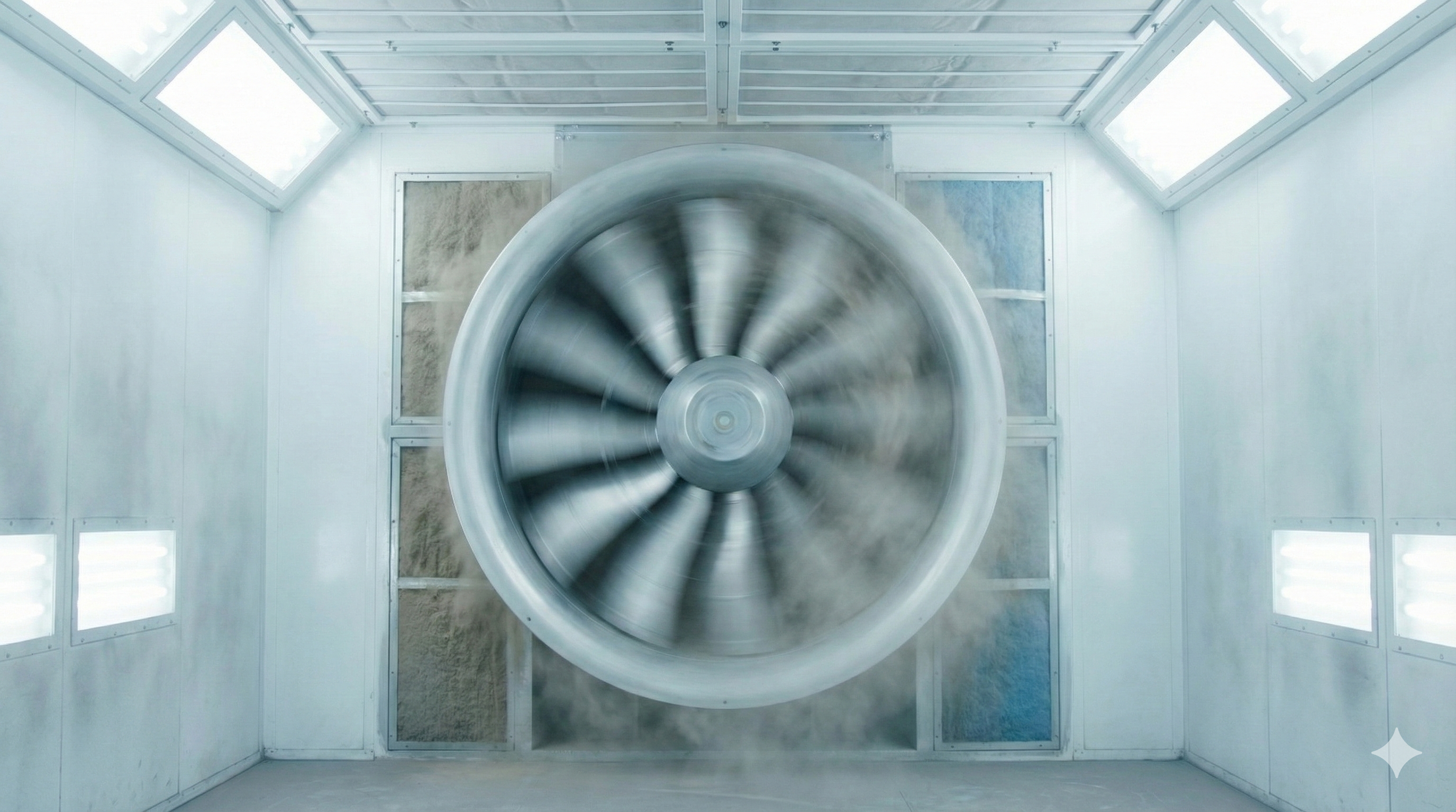Durante la aplicación de la pintura, las turbinas de impulsión y de extracción realizan un barrido interno de aire limpio desde la admisión, eliminando las partículas de polvo cuando el aire limpio pasa a través de los primeros filtros, entonces el aire limpio es enviado a la parte superior del techo de la cabina.